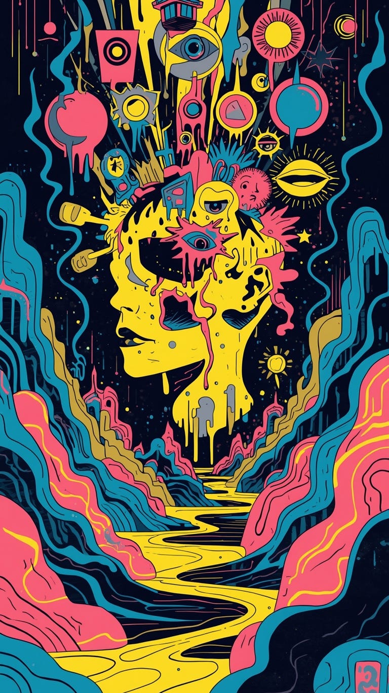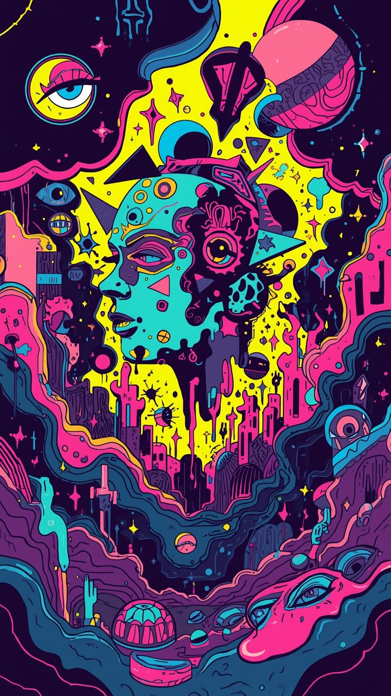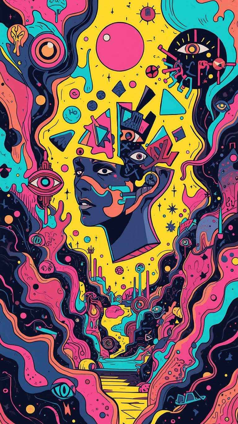 A surreal psychedelic illustration depicting a floating head fragmented into shapes within a dreamlike hallucinatory environment filled with symbolic elements such as digital glyphs, eyes, abstract faces, and liquid geometry. The scene follows dream logic rather than realism, with bold graphic shapes, fluid forms, and layered visual storytelling. The color palette is intensely neon and high-contrast, dominated by acid yellow, neon pink, cobalt blue, and graphite black, creating a vivid, otherworldly atmosphere. Flat illustration style with subtle texture, clean edges, and strong silhouettes, balanced between chaos and composition. Whimsical yet unsettling tone, playful surrealism, visual overload without realism, no photographic detail, no 3D rendering, no cinematic lighting, no text. High-voltage psychedelic artwork.