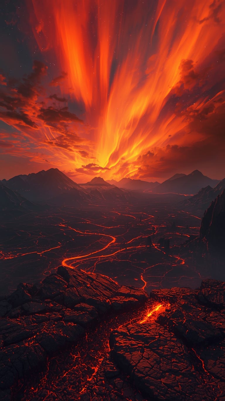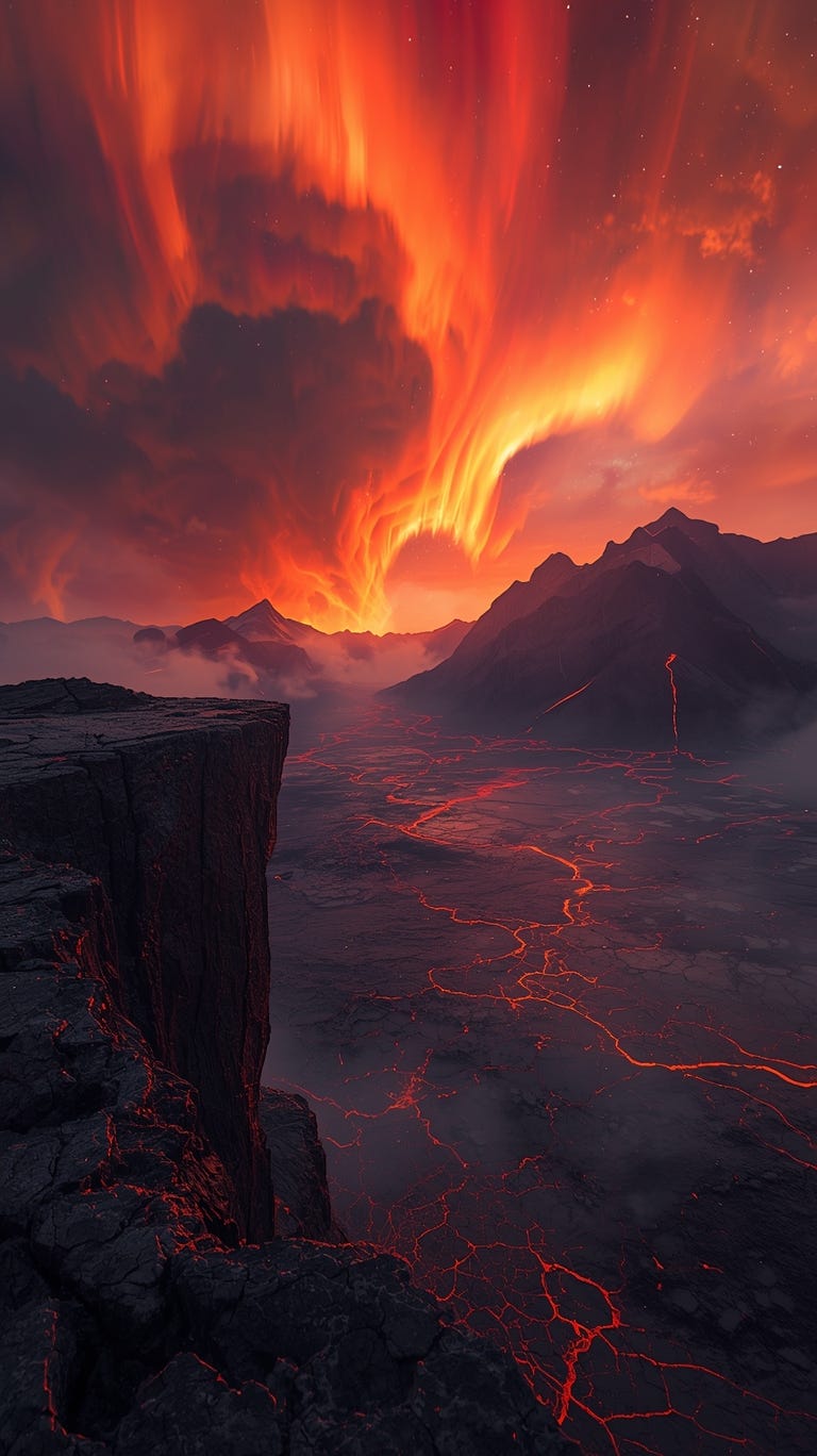 TEXT ON COVER: No text unless added manually. COVER TYPE: High-end photoreal dark fantasy landscape art. MAIN SUBJECT: Charred volcanic cliff overlooking a vast scorched valley. Sky torn open by a blazing infernal aurora—fiery ribbons twisting like molten fire across the heavens. SECONDARY: Cracked lava plains glowing faintly, drifting ember smoke, jagged obsidian peaks, heat shimmer rising from fissures. COMPOSITION: Wide cinematic frame. Foreground → dark volcanic rock. Midground → ember-lit valley. Background → razor mountains beneath a burning aurora storm. LIGHTING: Lava-red ambient glow mixed with fiery aurora streaks. Deep shadows, harsh highlights, volatile sky illumination. TEXTURES: Molten cracks, rough basalt, drifting ash, glowing atmospheric embers, sharp aurora fire trails. COLORS: Primary: volcanic reds, molten oranges, infernal golds. Secondary: deep blacks, smoldering crimson haze. STYLE: Dark infernal realism with mythic sky energy. 8K clarity, cinematic intensity, heavy dramatic atmosphere. POST-PROCESSING: Boost ember glow, sharpen volcanic textures, deepen red shadows, amplify aurora fire streaks. NEGATIVE: No people, no text, no artifacts, no distortions.
